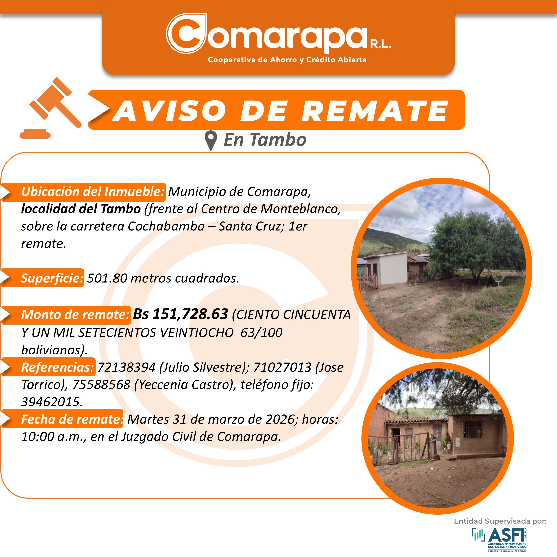 - Fecha de remate: Martes 31 de marzo de 2026; horas: 10:00 a.m., en el Juzgado Civil de Comarapa.